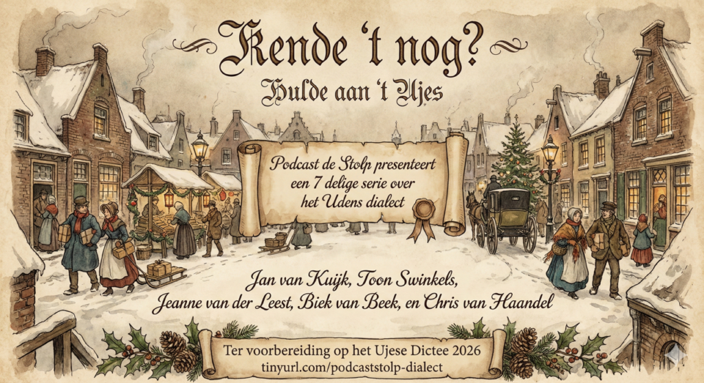 Morgen komt de eerste puzzel op weg naar het komende dictee. Wil je meer weten over het Újes dialect? Typ het adres in, dat op bijgaande afbeelding staat. Je komt dan op de podcasts van de Heemkunde Kring Uden. En dan: luisteren maar!